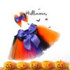 A Jardineira Halloween Saia de Tule para Cachorro, possui abertura frontal e fechamento por velcro, saia com tule nas cores laranja e preto. As alça são de tricoline 100% algodão e também possui um laço laranja com detalhe de abóbora.