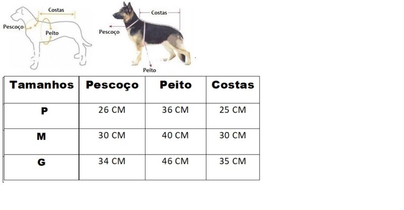 Disponibilizamos uma tabela com as medidas e também uma imagem ensinando a como medir o seu pet. É simples, basta fazer como demostrado na imagem abaixo.