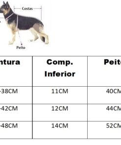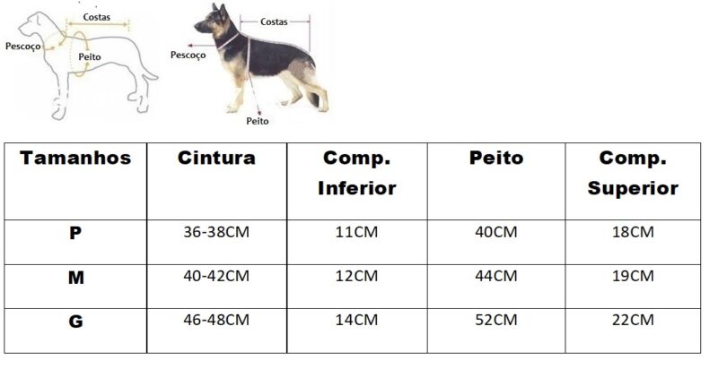 Disponibilizamos uma tabela com as medidas e também uma imagem ensinando a como medir o seu pet. É simples, basta fazer como a imagem está demonstrando.
