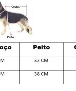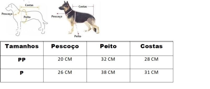 Disponibilizamos uma tabela com as medidas e também uma imagem ensinando a medir o seu pet. É simples, basta fazer como a imagem está demonstrando.