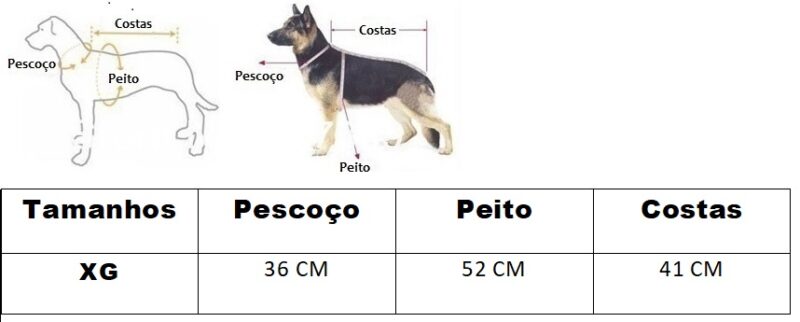 Disponibilizamos uma tabela com as medidas e também uma imagem ensinando a medir o seu pet. É simples, basta fazer como a imagem está demonstrando.
