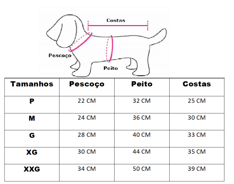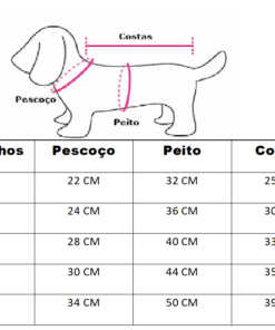 Disponibilizamos uma tabela com as medidas e também uma imagem ensinando a medir o seu pet. É simples, basta fazer como a imagem está demonstrando.