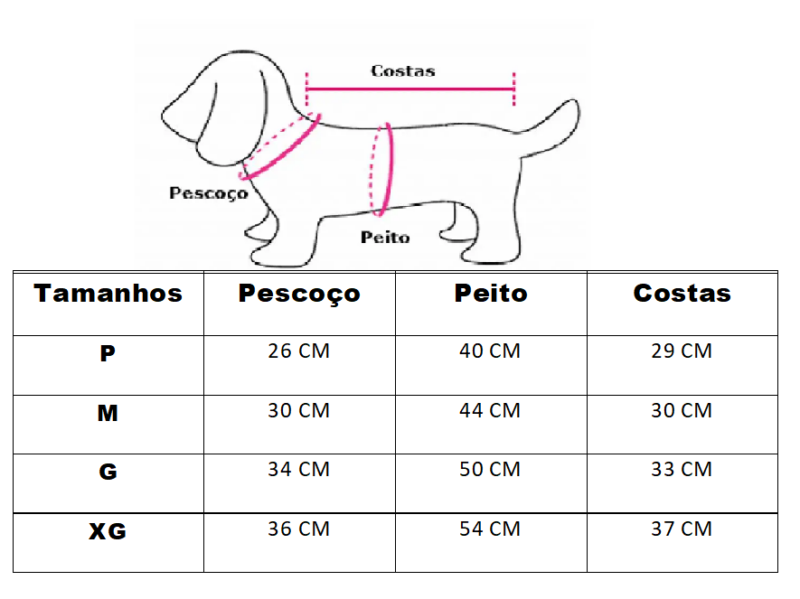 Disponibilizamos uma tabela com as medidas e também uma imagem ensinando a medir o seu pet. É simples, basta fazer como a imagem está demonstrando.