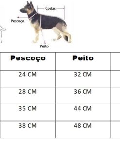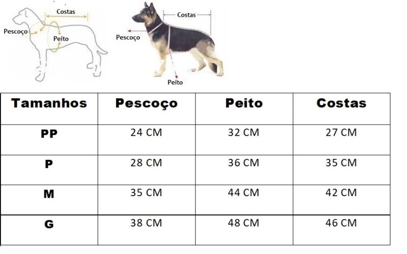 Disponibilizamos uma tabela com as medidas e também uma imagem ensinando como medir seu pet. É simples, basta fazer como na imagem abaixo.