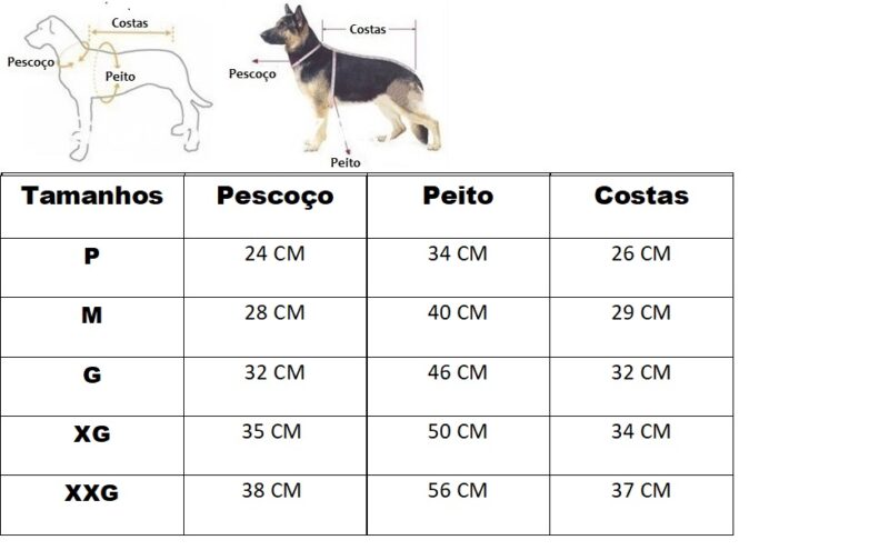 Disponibilizamos uma tabela de medidas e também uma imagem ensinando a medir o seu pet.