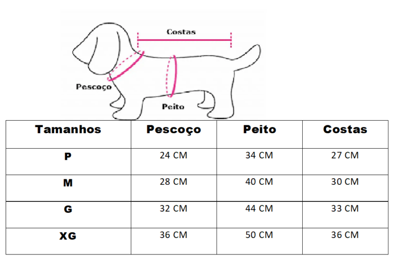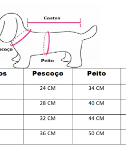 Disponibilizamos uma tabela com as medidas e também uma imagem ensinando a medir o seu pet. É simples, basta fazer como demonstrado na imagem.