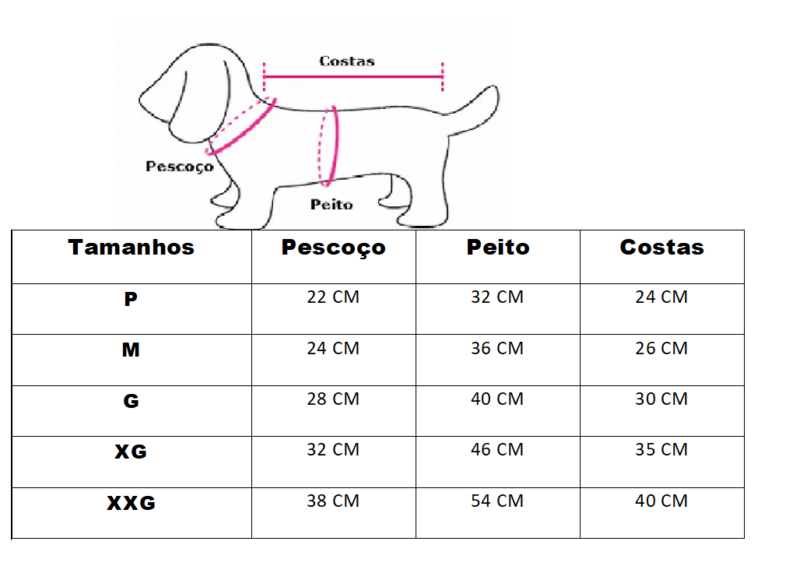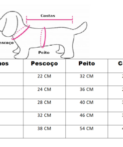 Disponibilizamos uma tabela com as medidas e também uma imagem ensinando a medir o seu pet. É simples, basta fazer como demonstrado na imagem.