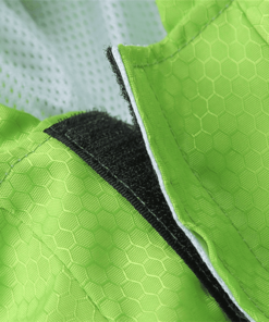 É uma peça leve e prática que possui abertura frontal, fechamento por velcro e abertura para guia.