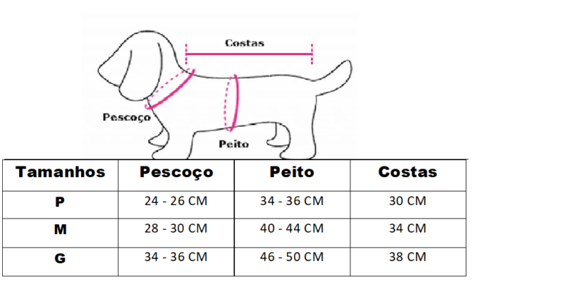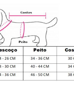 Disponibilizamos uma tabela com as medidas e também uma imagem ensinando a como medir o seu pet. É simples, basta fazer como a imagem está demonstrando.