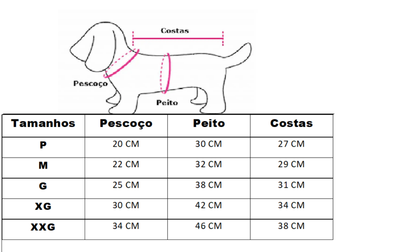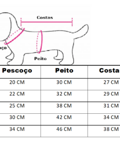 Disponibilizamos uma tabela com as medidas e uma imagem ensinando a medir o seu pet. É simples, basta fazer como a imagem está demonstrando.