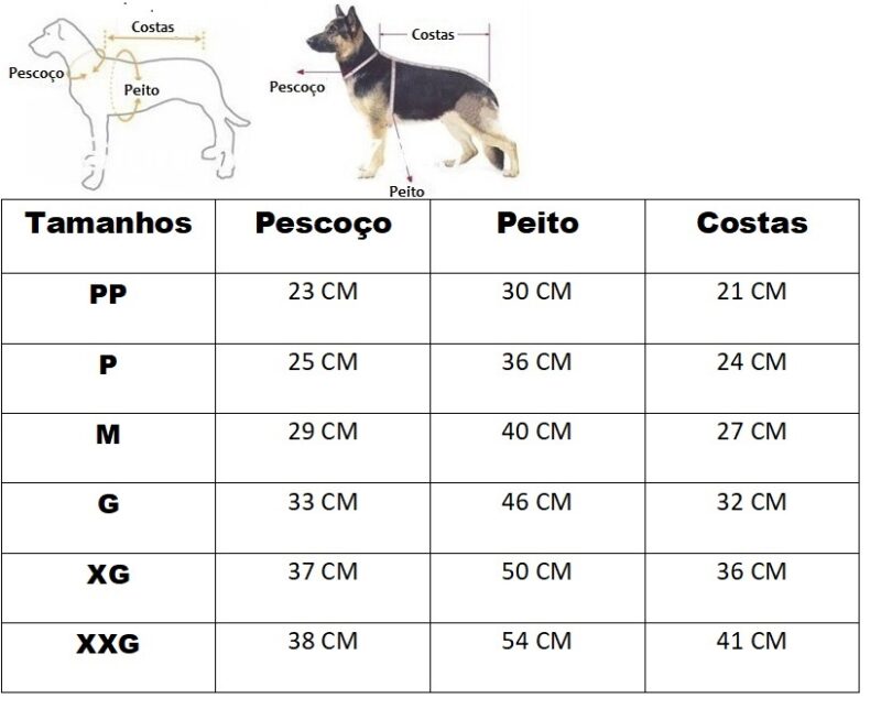 Disponibilizamos uma tabela com as medidas e também uma imagem ensinando a medir seu pet. É simples, basta fazer como na imagem abaixo.