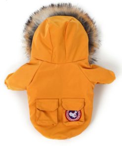 A Jaqueta Amarela Capuz de Pêlos para Cachorro, possui abertura frontal e fechamento por zíper.