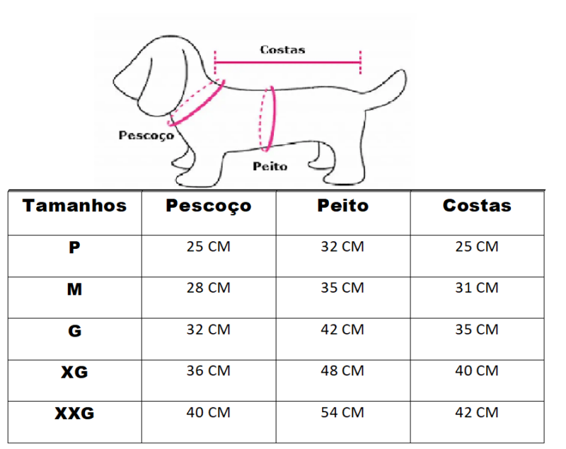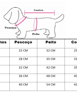 Disponibilizamos uma tabela com as medidas e também uma imagem ensinando a medir o seu pet. É simples, basta fazer como a imagem está demonstrando.