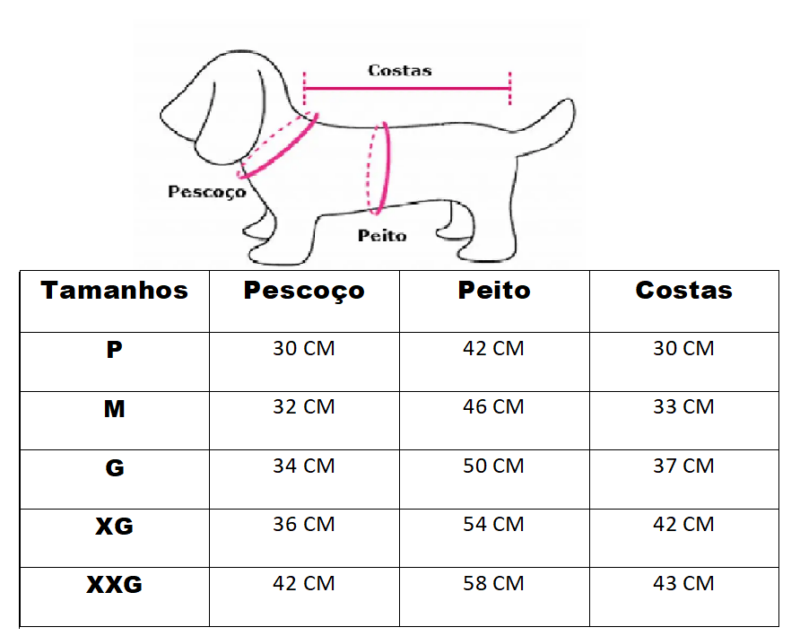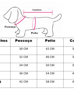 Disponibilizamos uma tabela com as medidas e também uma imagem ensinando a medir o seu pet. É simples, basta fazer como a imagem está demonstrando.