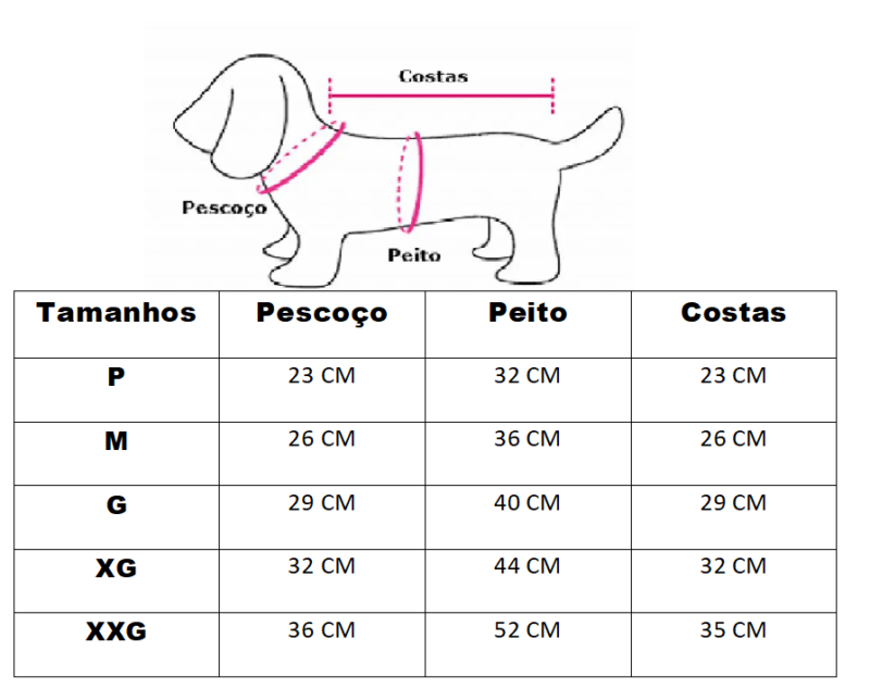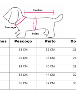 Disponibilizamos uma tabela com as medidas e também uma imagem ensinando a medir o seu pet. É simples, basta fazer como a imagem está demonstrando.