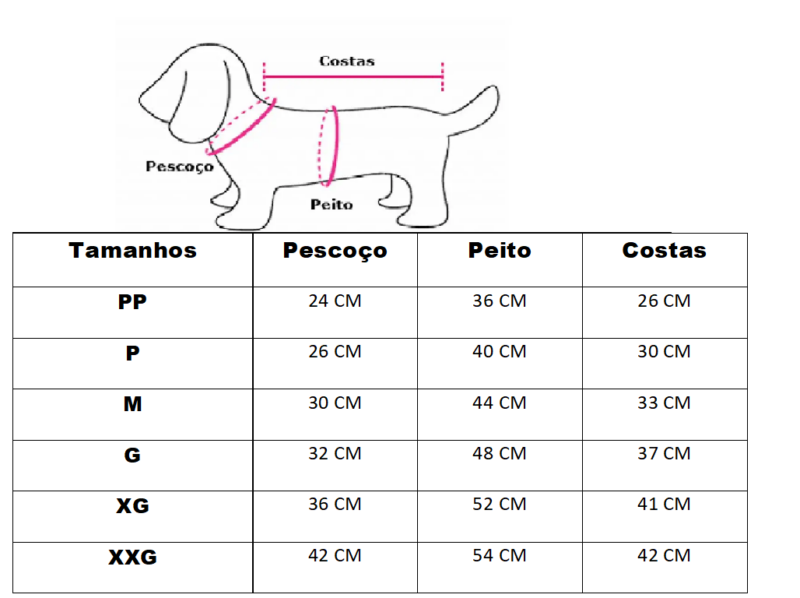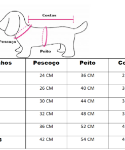 Disponibilizamos uma tabela com as medidas e também uma imagem ensinando a medir o seu pet. É simples, basta fazer como a imagem está demonstrando.