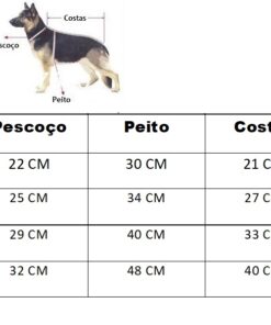 Disponibilizamos uma tabela com as medidas e também disponibilizamos uma imagem ensinando a comer medir o seu pet. É simples, basta fazer como a imagem está demonstrando.