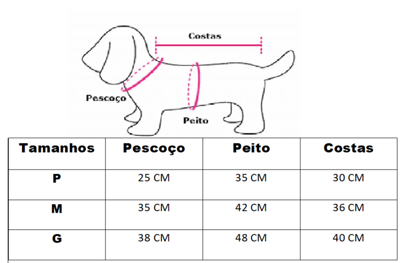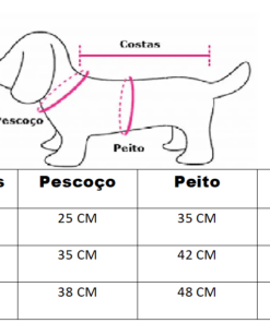 Disponibilizamos uma tabela com as medidas e também uma imagem ensinando a medir o seu pet.