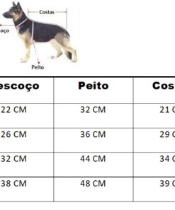 Disponibilizamos uma tabela com as medidas e também uma imagem ensinando a medir o seu pet. É simples, basta fazer como a imagem está demonstrando.