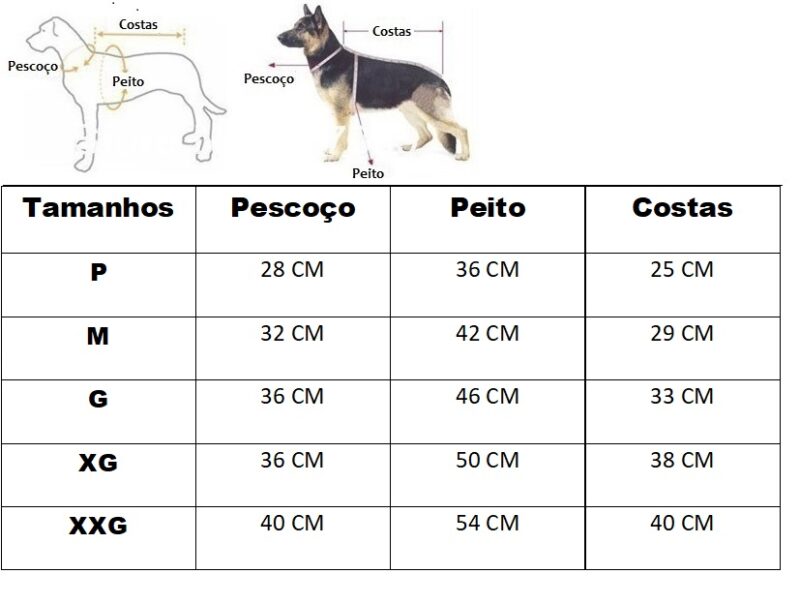Disponibilizamos uma tabela com as medidas e uma imagem ensinando a medir o seu pet. É simples, basta fazer como demonstrado na imagem.