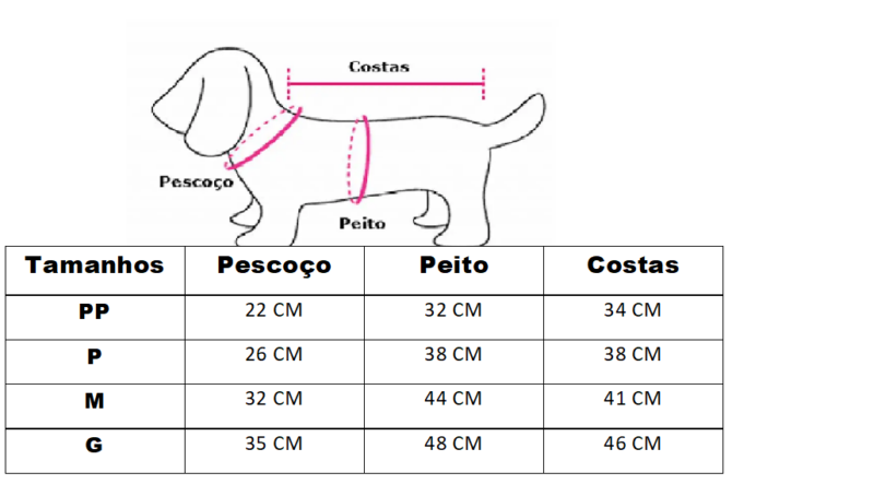Disponibilizamos uma tabela com as medidas e também uma imagem ensinando a medir a sua pet.