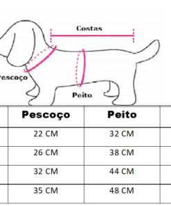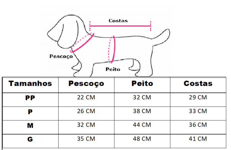 Disponibilizamos uma tabela com as medidas e também uma imagem ensinando a medir a sua pet.