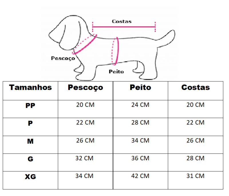 Disponibilizamos uma tabela com as medidas e também uma imagem ensinando a medir o seu pet. É simples, basta fazer como na imagem abaixo.