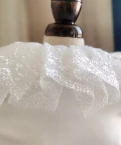O Vestido possui renda de altíssima qualidade, forro interno de cetim, saia de tule, abertura frontal, fechamento por velcro e laço com pérolas.