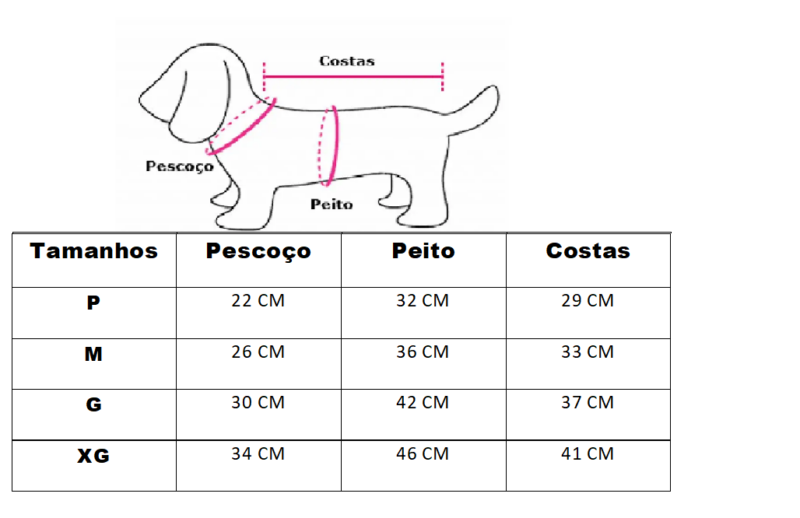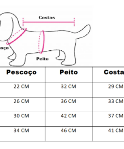 Disponibilizamos uma tabela com as medidas e também uma imagem ensinando a medir a sua pet.