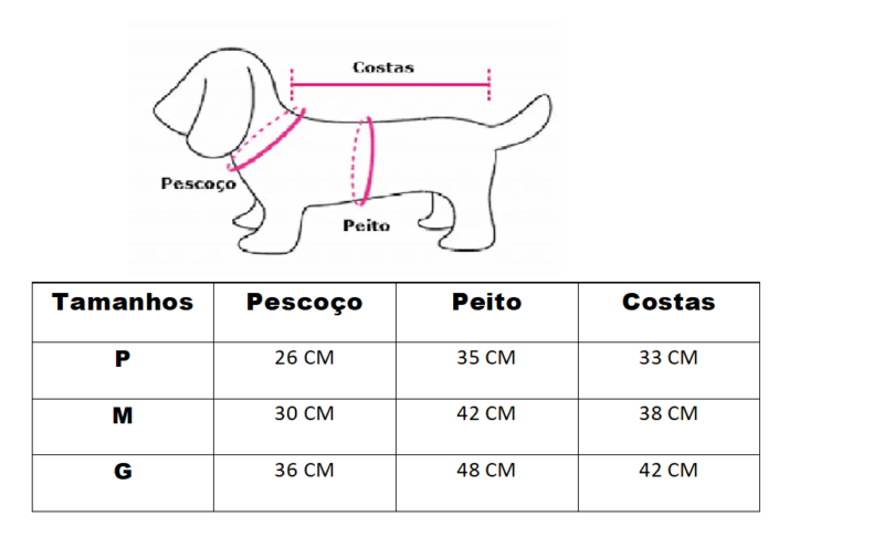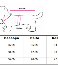 Disponibilizamos uma tabela com as medidas e também uma imagem ensinando como medir o seu pet. É simples, basta fazer como a imagem está demonstrando.