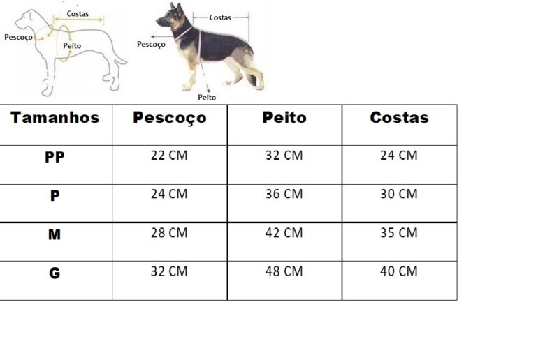 Disponibilizamos uma tabela de medidas e também uma imagem ensinando a medir o seu pet. É simples, basta fazer como demonstrado na imagem abaixo.