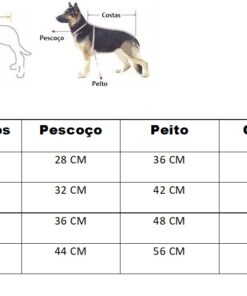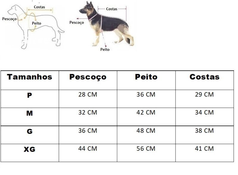 Disponibilizamos uma tabela de medidas e também uma imagem ensinando a como medir o seu pet. É simples, basta fazer como na imagem.