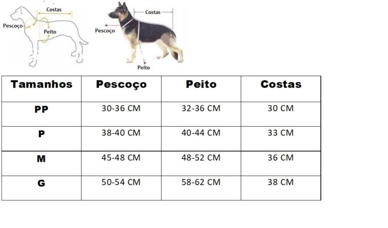 Disponibilizamos uma tabela com as medidas e uma imagem ensinando a medir o seu pet. É simples, basta fazer como a imagem está demonstrando.