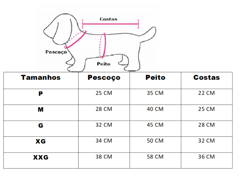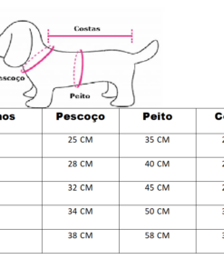 Disponibilizamos uma tabela com as medidas e também uma imagem ensinando a medir o seu pet. É simples, basta fazer como a imagem está demonstrando.