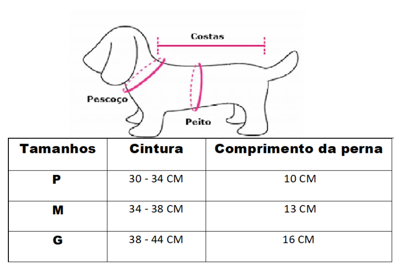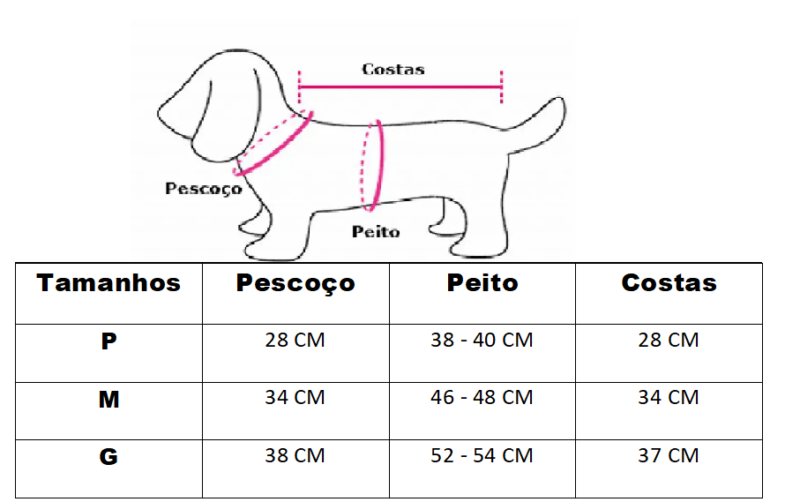 Disponibilizamos uma tabela de medidas e também uma imagem ensinando a medir o seu pet. É simples, basta fazer como na imagem.
