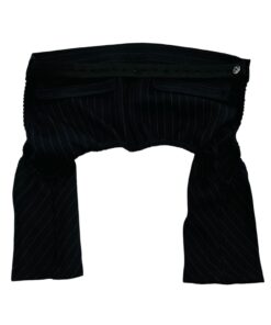 Confeccionado em tecido Risca de Giz, com gravata borboleta no mesmo tecido, camisa branca embutida no paletó, abertura frontal e fechamento por botões de pressão. Não possui elastano em sua composição.